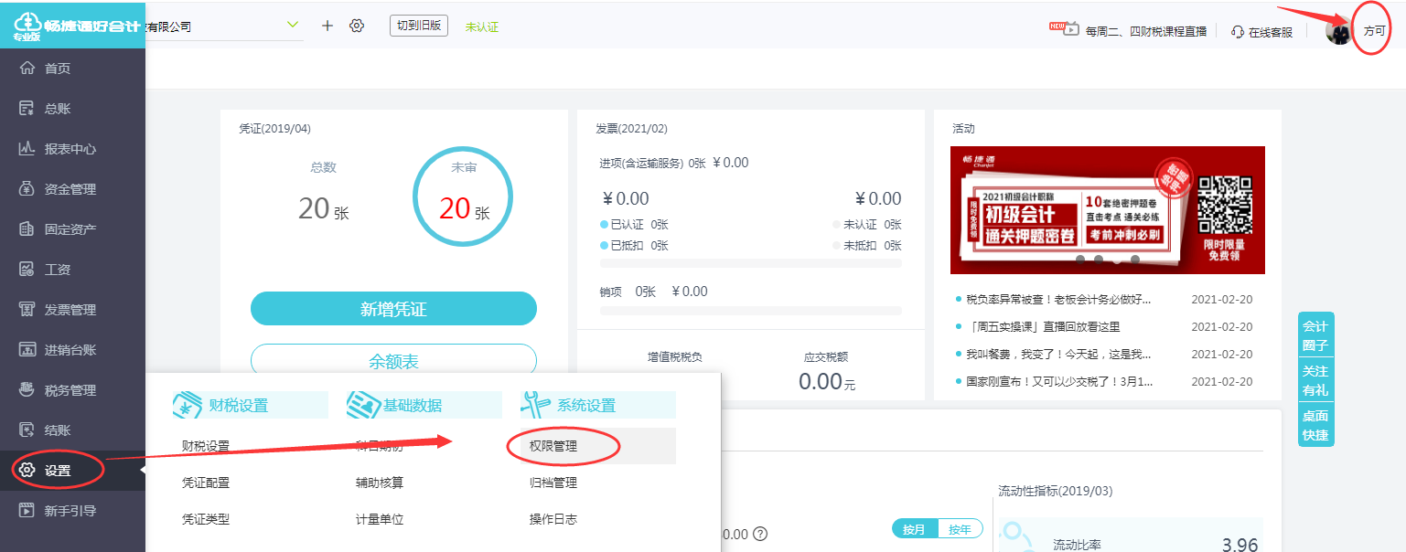 1、登錄管理員賬號(一般就是您的用戶賬號),點【設(shè)置】-【權(quán)限管理】,進(jìn)入【權(quán)限管理】操作界面。