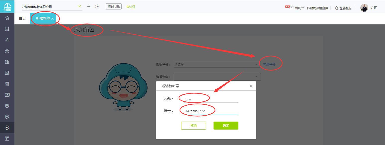 2、在【權(quán)限管理】操作界面,點右上角添加角色,彈出框子,再點【新建賬號】,輸入新增用戶的名稱和手機號,然后點確定就可以了。