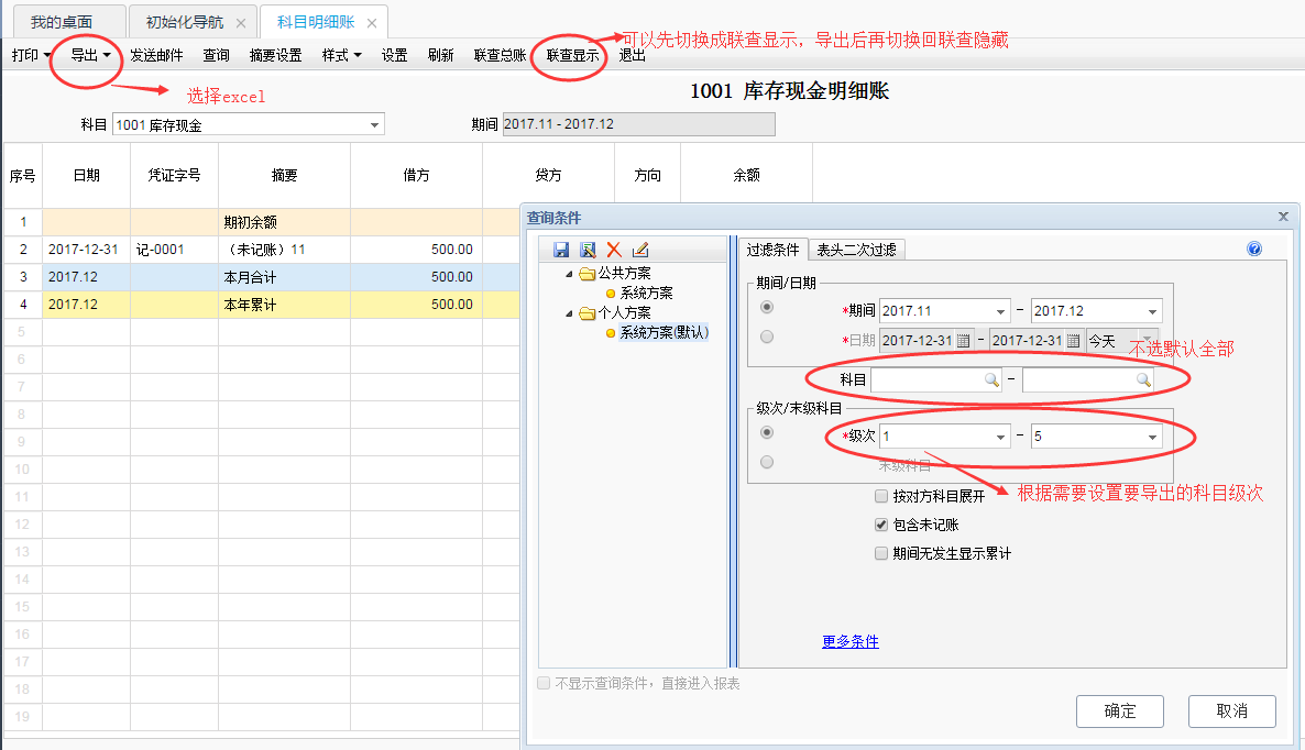 科目明細(xì)賬查詢條件中,科目不選擇,默認(rèn)就是所有??梢愿鶕?jù)需要設(shè)置導(dǎo)出的級(jí)次或只是末級(jí)科目,這樣查詢結(jié)果就是自己所需要的明細(xì)科目了,然后進(jìn)入明細(xì)賬,點(diǎn)導(dǎo)出,選擇excel即可。
