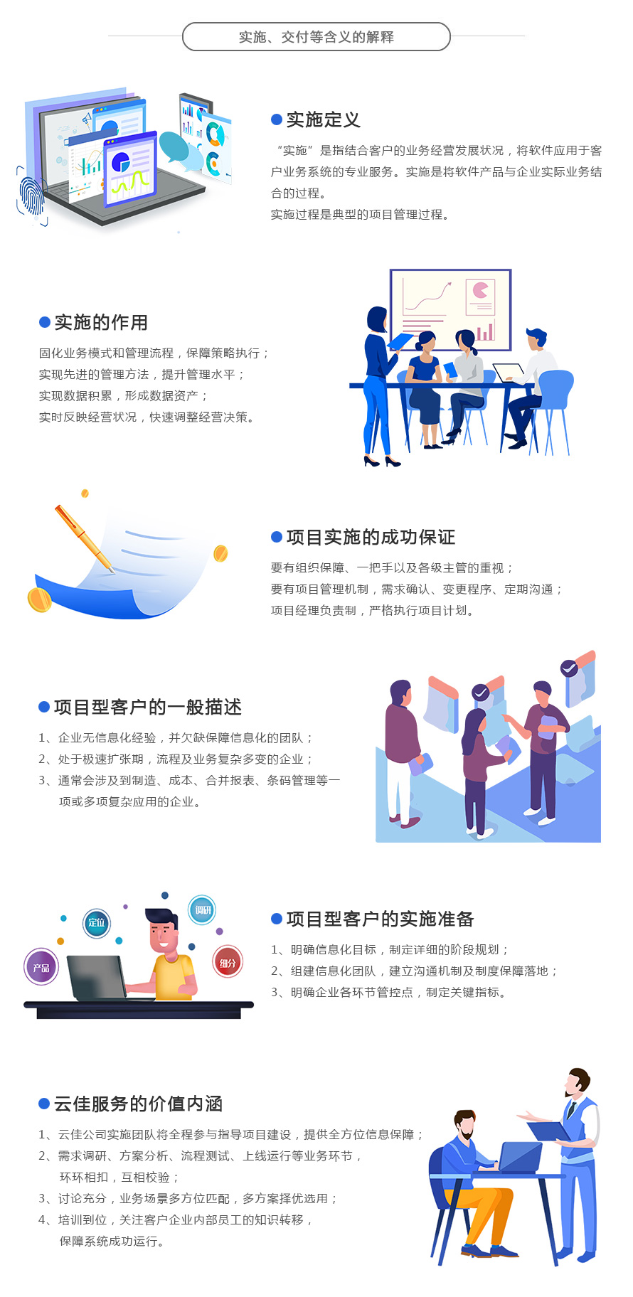云佳公司目前約70%已合作客戶的需求其實(shí)都是基于產(chǎn)品的標(biāo)準(zhǔn)化應(yīng)用,基于對數(shù)以千計(jì)的已合作客戶提供技術(shù)服務(wù)業(yè)務(wù)的經(jīng)驗(yàn)總結(jié),云佳公司摸索出一套基于產(chǎn)品標(biāo)準(zhǔn)化應(yīng)用的一般標(biāo)準(zhǔn)服務(wù)運(yùn)行體系,從把控客戶實(shí)際需求、實(shí)施、培訓(xùn)、交付、日常售后維護(hù)、客戶升級應(yīng)用等技術(shù)服務(wù)業(yè)務(wù)環(huán)節(jié)為公司已合作客戶提供一整套標(biāo)準(zhǔn)化服務(wù),幫助此類客戶快速上手使用我司提供的軟件產(chǎn)品,并充分發(fā)揮出軟件的應(yīng)用功能和價(jià)值亮點(diǎn),達(dá)到最佳的企業(yè)信息化應(yīng)用效果!
